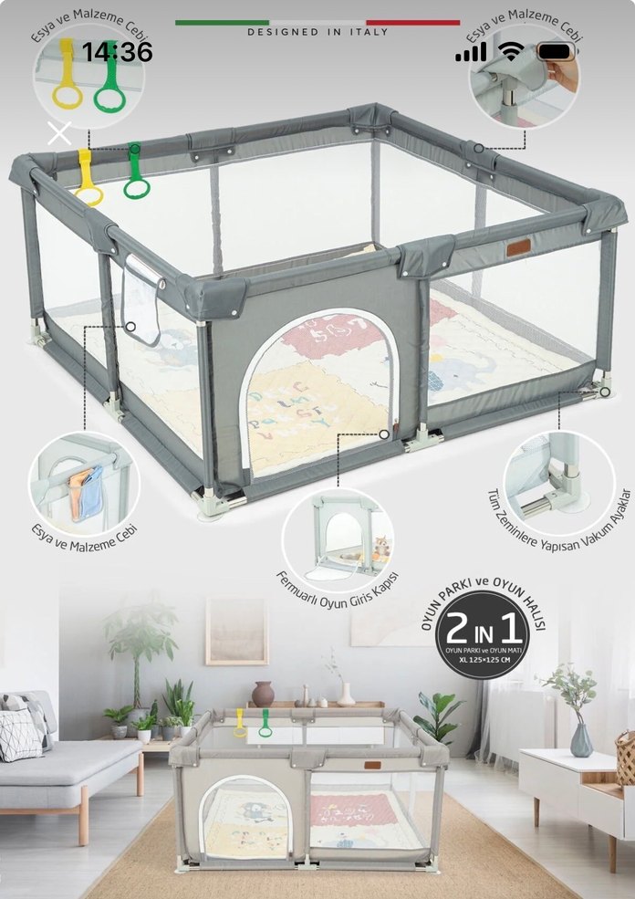 Gri renkli oyun parkı ve yatak, 2'si 1 arada tasarıma sahip. Yumuşak mat, saklama cepleri ve kolay montaj özellikleri bulunur. ️