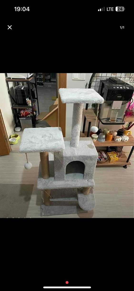 SIFIR ÜRÜN HİÇ KULLANILMADI .Yumuşak kumaş kaplı gri kedi evi, çok katmanlı platformlar, saklanma alanı ve tırmanma direkleri içerir.