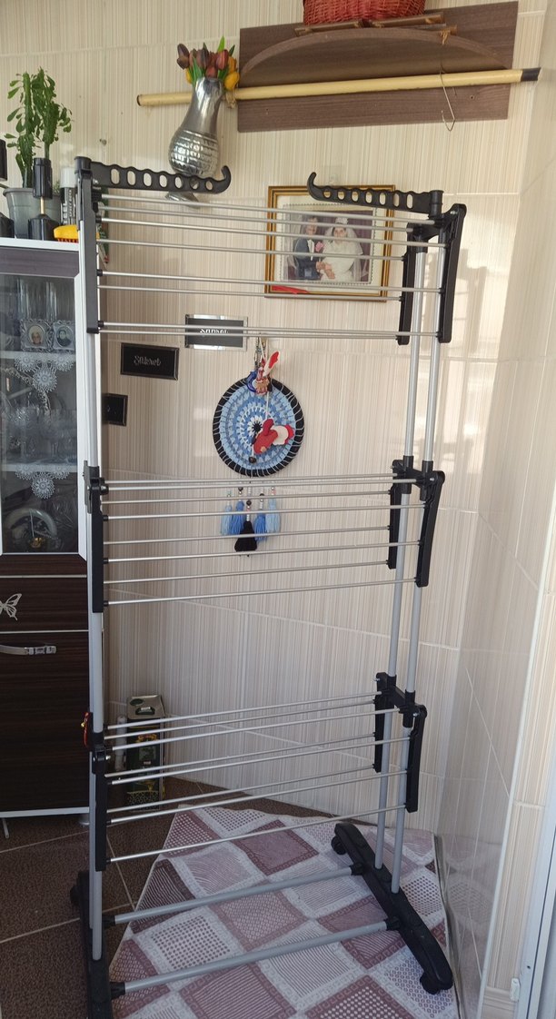 Gri çok katmanlı askılık, dayanıklı siyah bağlantılarla desteklenmiş, çok sayıda çamaşır kurutma çubuğuna sahip, iç mekan kullanımı için uygundur. sayılı kullanıldı ufak tefek sorunlar var çok hafif kıtusuda var kurutma makinesi aldım o yüzden satıyorum
