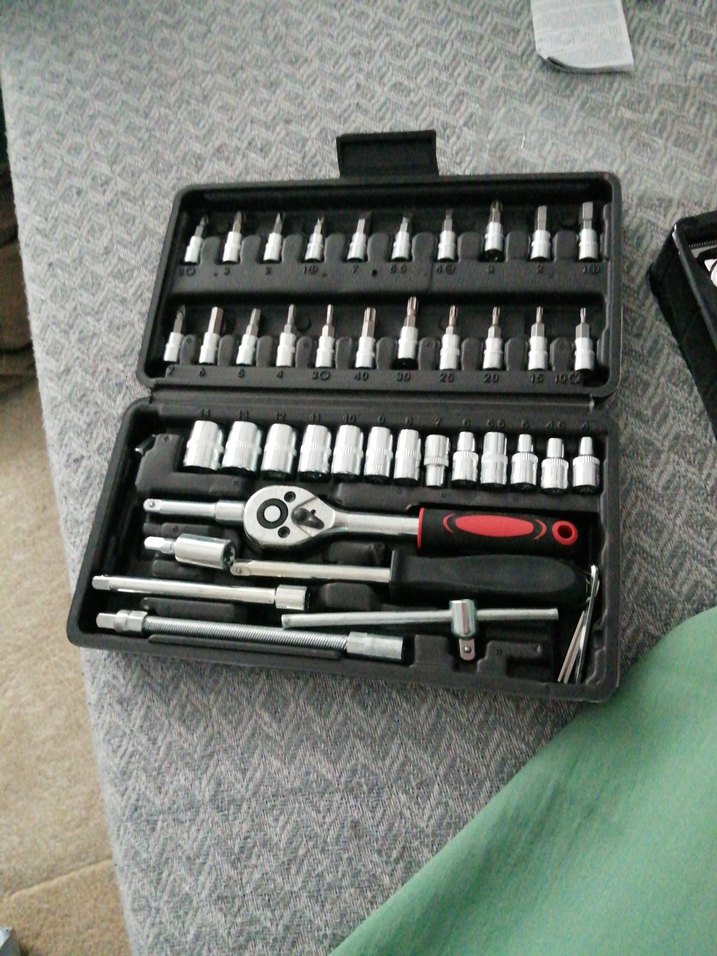 Koyu gri renkte, çeşitli tornavida uçları ve sapları içeren 46 parça lokma seti. İhtiyaç fazlası sıfır ürün