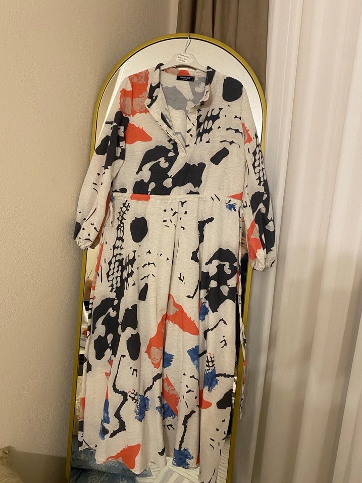 Keten kumaştan, bol kesim, kısa kollu, yakalı, drapeli, gri çok renkli bağlama desenli uzun elbise. Bir kez giyildi 36 beden diyor ama gayet 38/40 bedene uyumludur