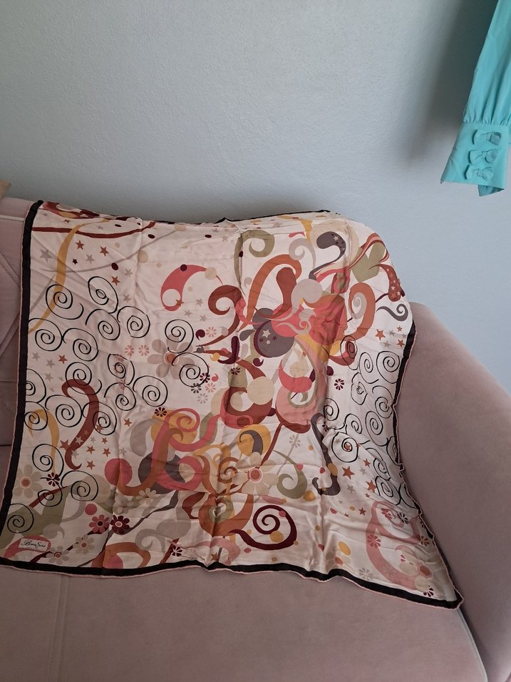 Gri tabanlı çok renkli soyut desenli, yumuşak sentetik kumaştan drapeli kadın şalı. Rahat, bohem tarzına uygundur.