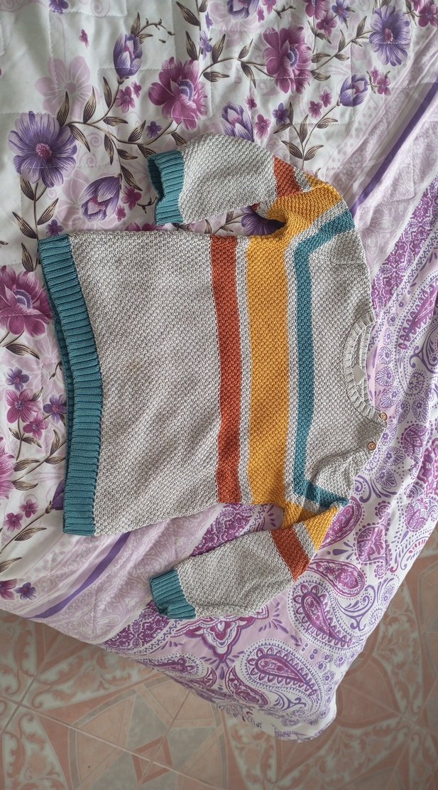 Gri renkte, çok renkli çizgili, bohem tarzda, uzun kollu ve salaş kesim çocuk örgü kazak. Rahat ve günlük kullanıma uygun.
