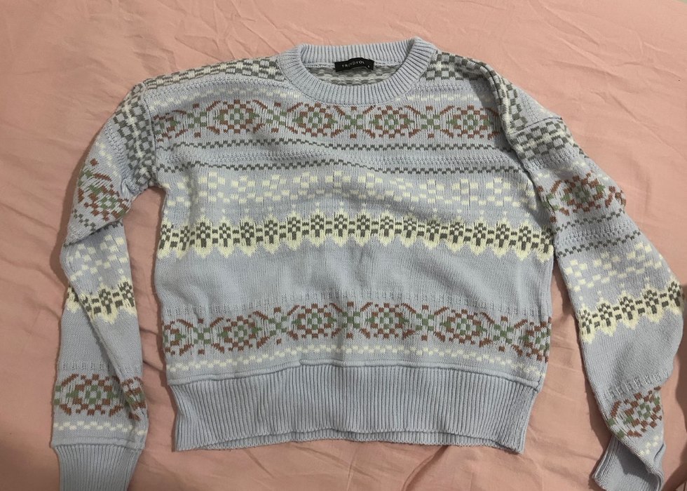 Gri renkte, bohem tarzda, çok renkli desenli, yuvarlak yakalı, uzun kollu, rahat kesim örgü kazak. Midi uzunluğunda ve günlük kullanıma uygun.