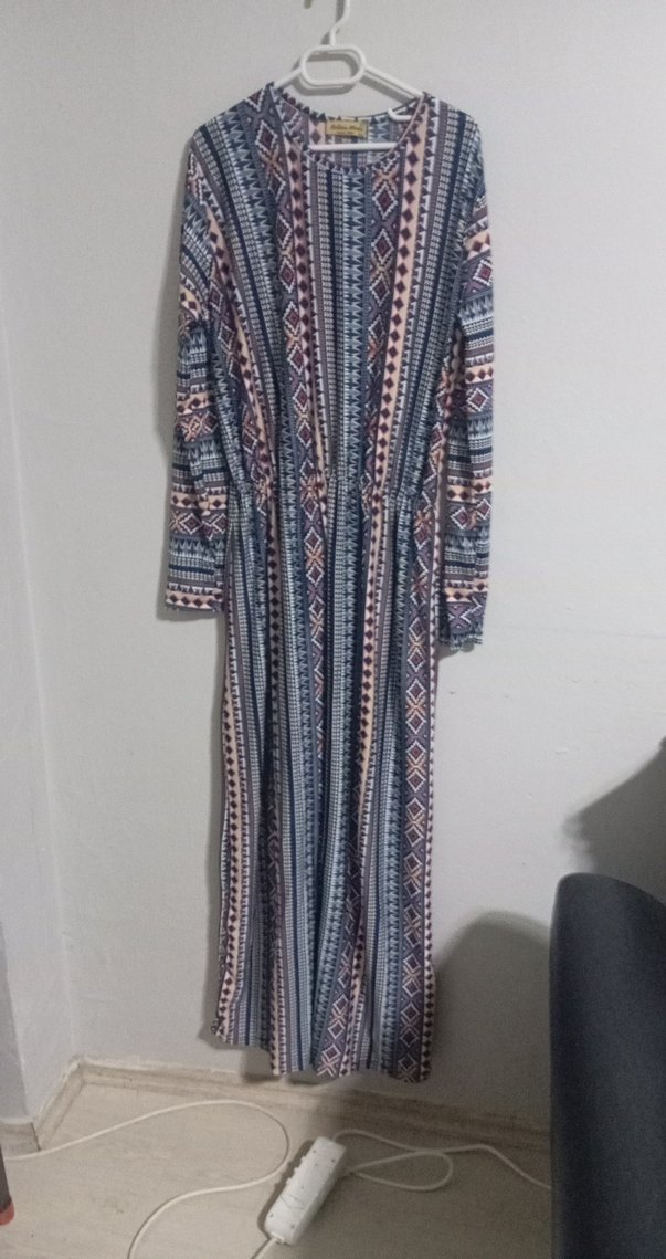 Gri tonlarda çok renkli, bol kesim, pile detaylı uzun elbise. Uzun kollu ve tekne yaka, sentetik kumaştan günlük kullanım için uygun.