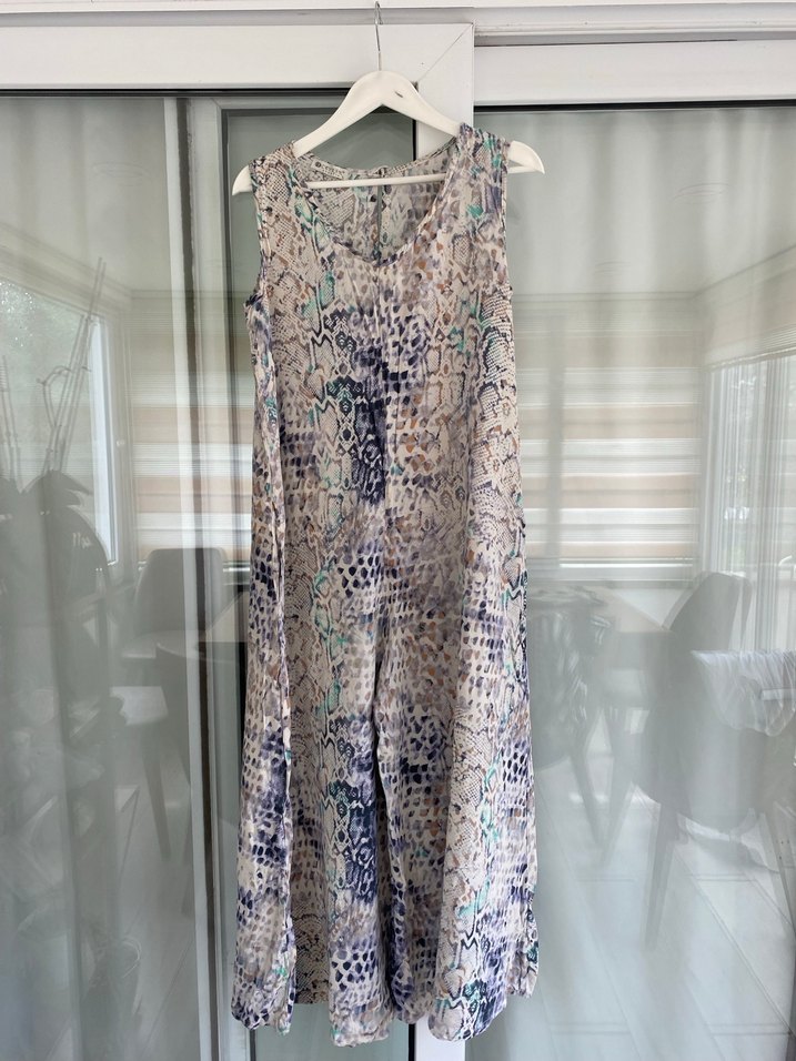 Gri çok renkli batik desenli, V yakalı, bol kesim ve dökümlü uzun tulum. Yumuşak keten kumaştan yapılmıştır ve bohem tarzını yansıtır.