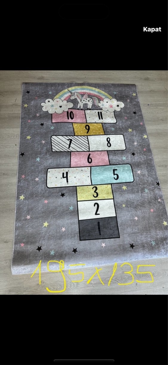 Gri zemin üzerinde çok renkli sek sek ve gökkuşağı altında tek boynuzlu at figürü olan çocuk halısı. Yumuşak ve eğlenceli bir tasarıma sahiptir.