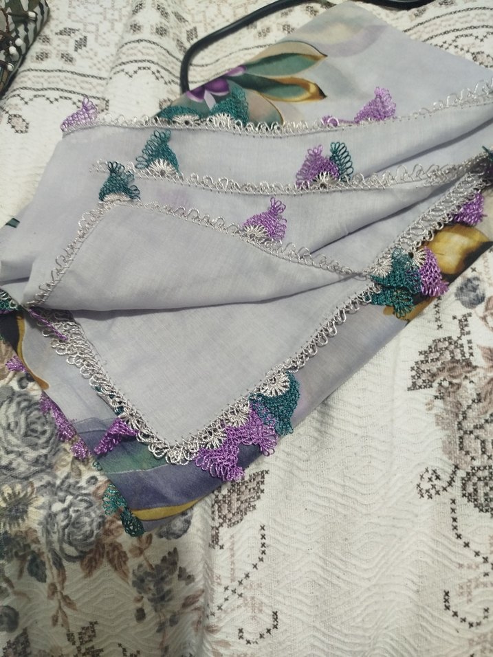 Gri tekstil üzerine çok renkli dantel işlemeli, bohem tarzda kadın fuları.
