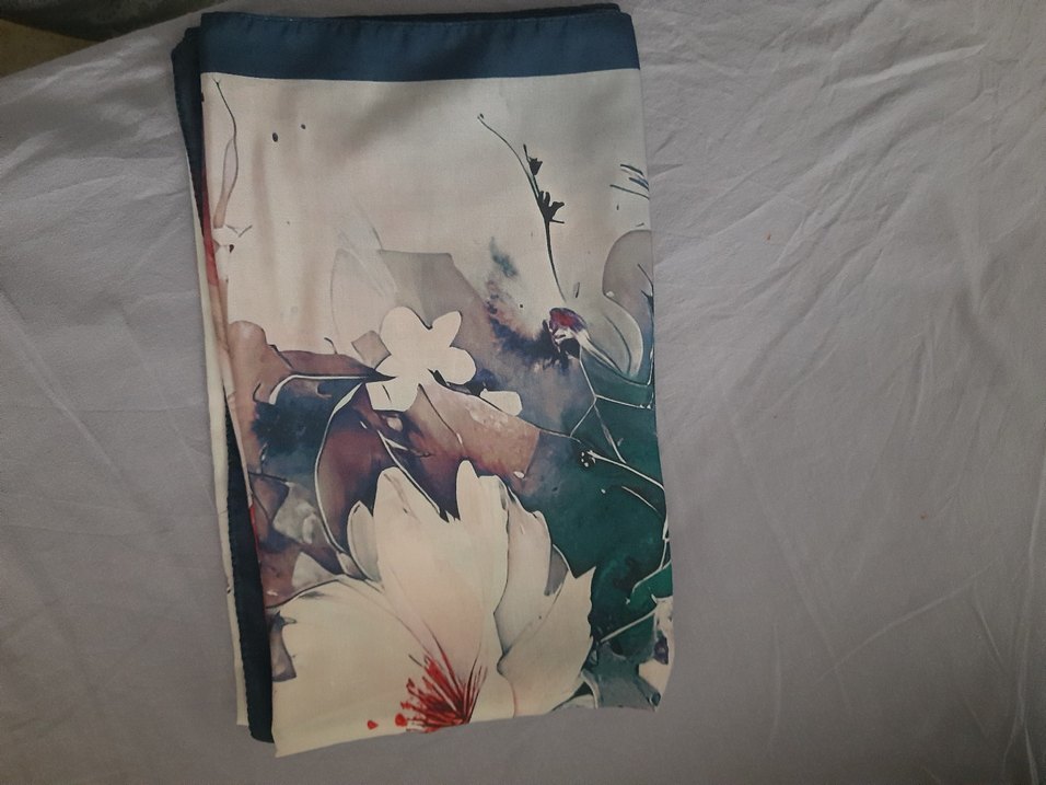 Kadınlar için ipek dokulu, gri zeminli ve çok renkli sanatsal çiçek desenli, çağdaş drapeli şal. Minimalist stil için uygun.