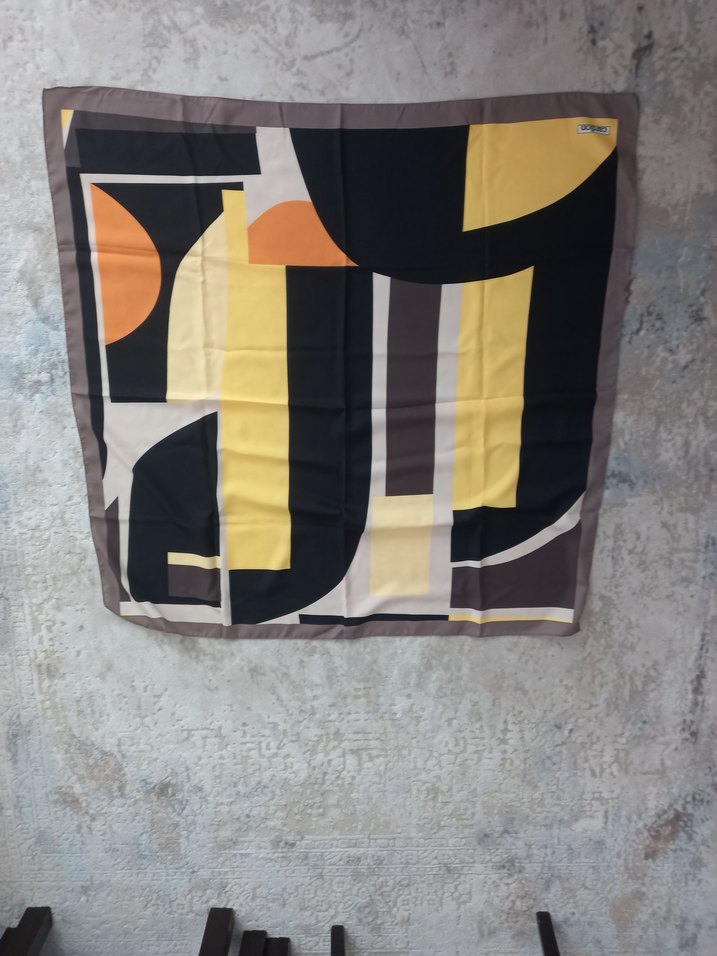 Kadınlar için çok renkli geometrik desenli, gri, siyah, sarı ve turuncu tonlarında eşarp. yarı ipek. cardion marka