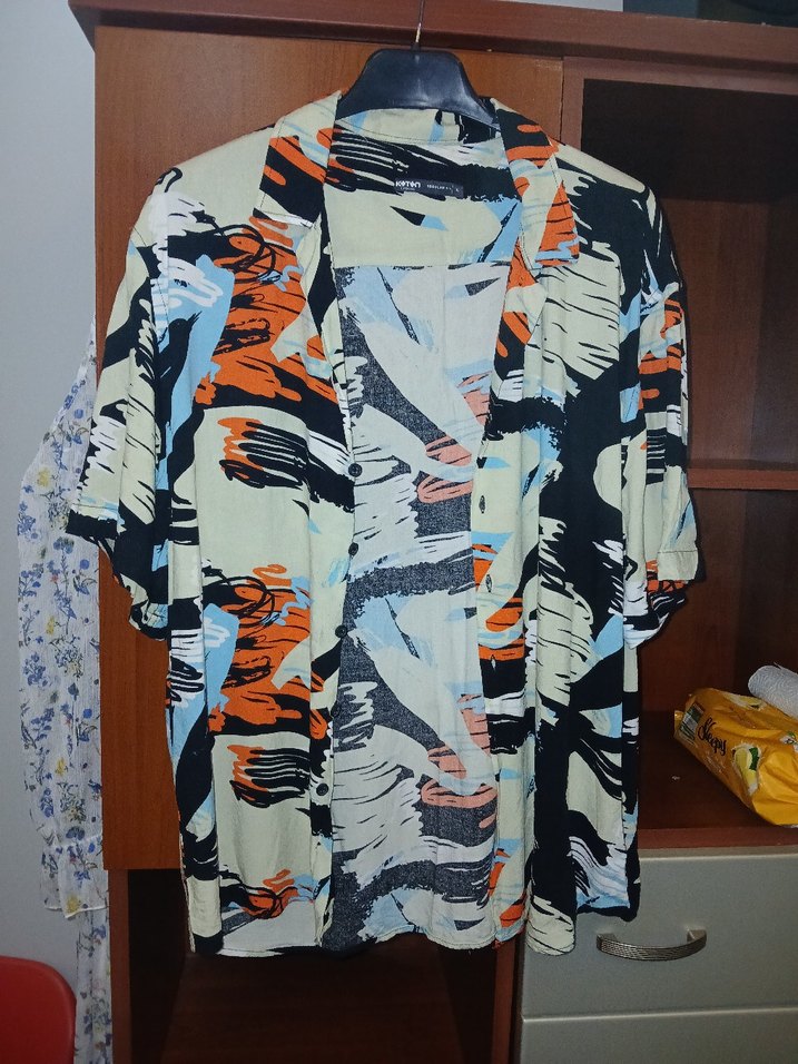 Gri çok renkli tie-dye desenli, düğmeli, V yaka, kısa kollu, sentetik kumaştan erkek gömleği. Rahat kesim, günlük kullanım için uygundur.