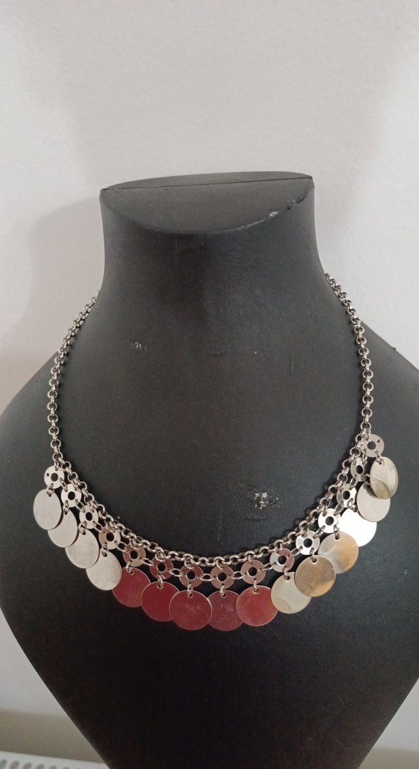 Gri çok renkli zincir detaylı, yuvarlak motifli midi uzunlukta bohem tarzda kolye. Romantik akşamlar için uygun.