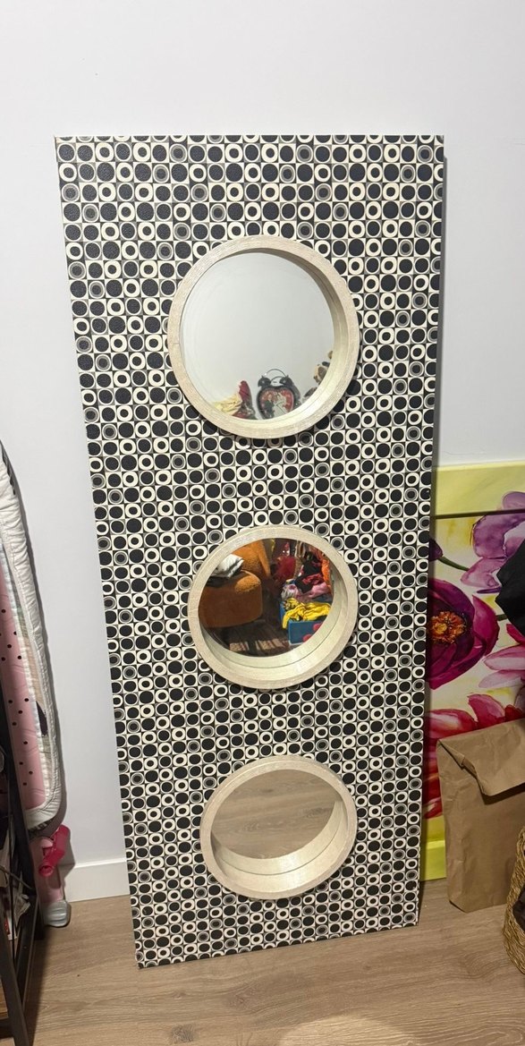 Gri desenli çerçevede üç yuvarlak ayna bulunan dekoratif panel, modern ve şık bir görünüm sunar.