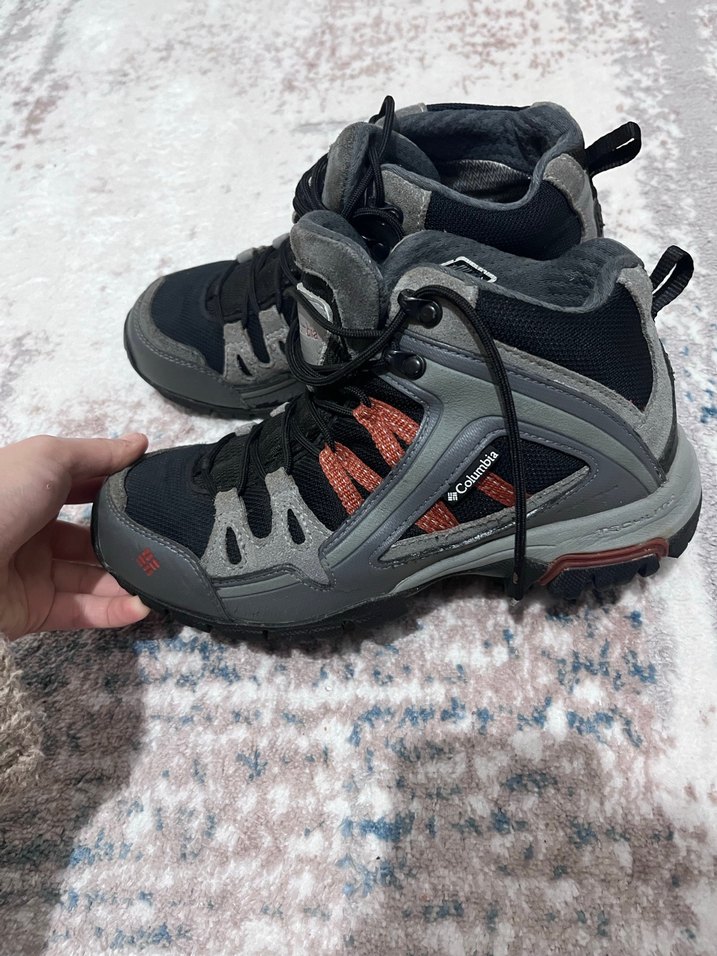 Gri Columbia outdoor ayakkabılar, kaymaz kauçuk taban ve yılan desenine sahip. Velcro bantlı, spor ve şık günlük kullanım için uygun.