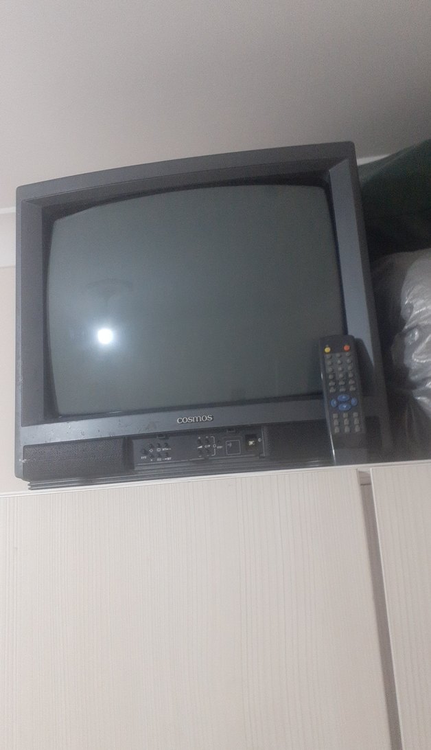 Kavisli ekrana sahip gri Cosmos CRT monitör ve yanında kumanda bulunur.#telefizyon#monitür