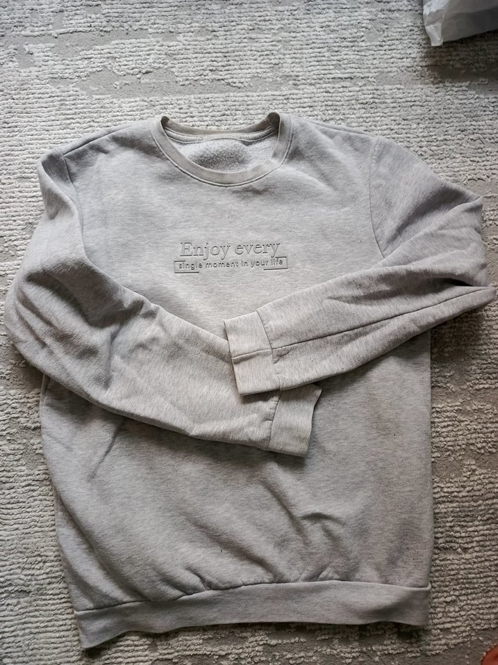 Yumuşak keten kumaştan, uzun kollu, gri ve bol kesim sweatshirt. Önünde "Enjoy every" yazısı ile rahat ve şık bir görünüm sunar. Günlük kullanım için uygundur. Unisex üründür sıkıntısı yoktur bedeni m ve s arasıdır