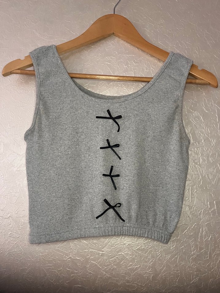 Gri renkli crop, önünde siyah kurdele detaylara sahiptir.