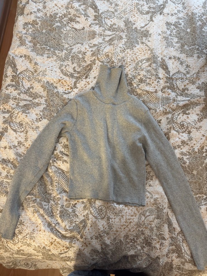 crop Gri renkli, boğazlı yaka ve uzun kollu, yumuşak yün kumaştan yapılmış, vücuda oturan kadın kazak.