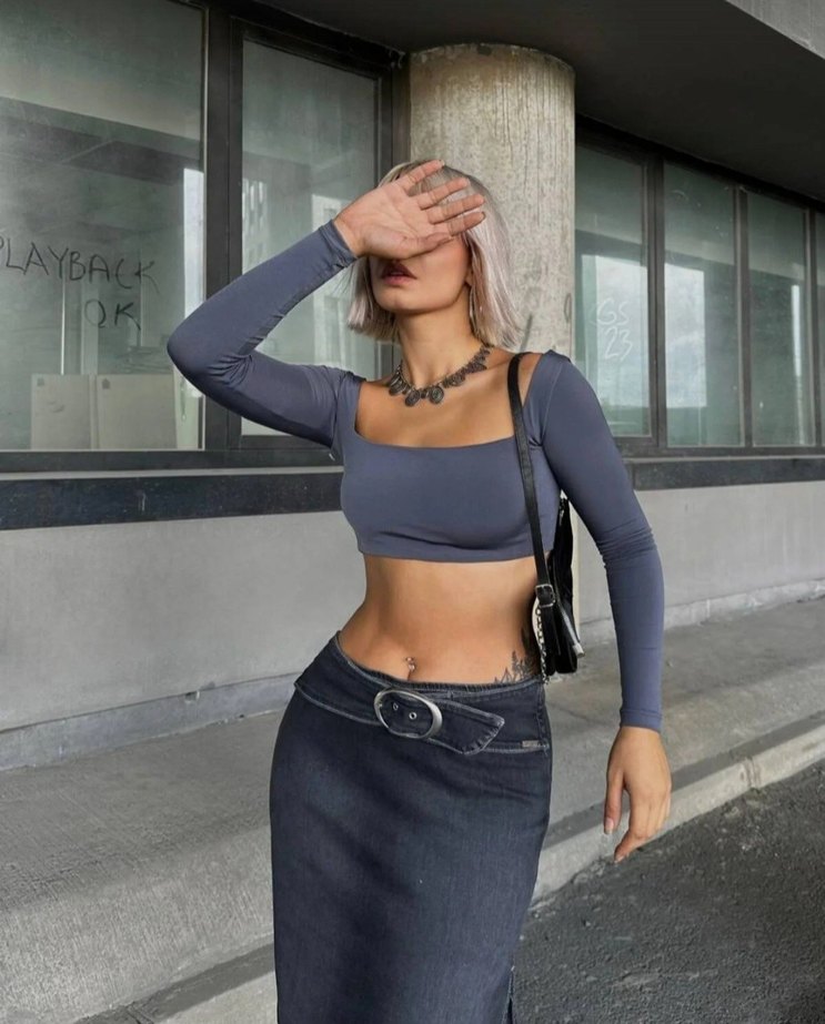 Gri, uzun kollu strappy crop top. Etiketi yok. Hiç kullanılmadı. iç etiketi L beden yanlış basılmış. S/M beden uyumludur