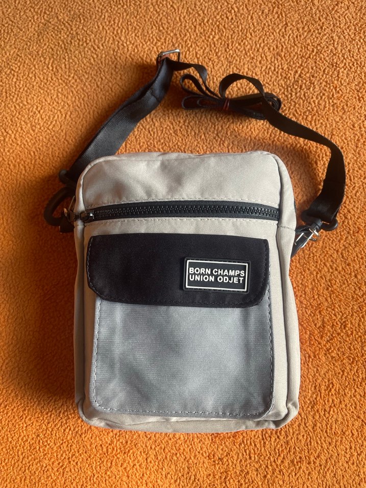 Gri renkli, yumuşak kumaştan yapılmış, önünde baskılı cep ve ayarlanabilir askıya sahip kadın crossbody çanta.