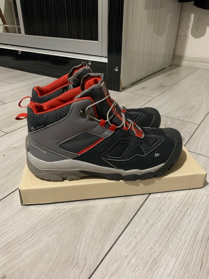 Gri renkli, kauçuk tabanlı, Velcro bantlı ve baskılı detaylara sahip crossrock bot su geçirmez iç taban ölçüsü 24 cm 37 numaraya uygun olur diye düşünüyorum