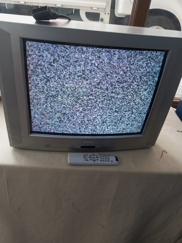 Ekranda karışık görüntü olan gri CRT monitör ve uzaktan kumanda ile birlikte sunuluyor. Dayanıklı yapıya sahip klasik tasarım.