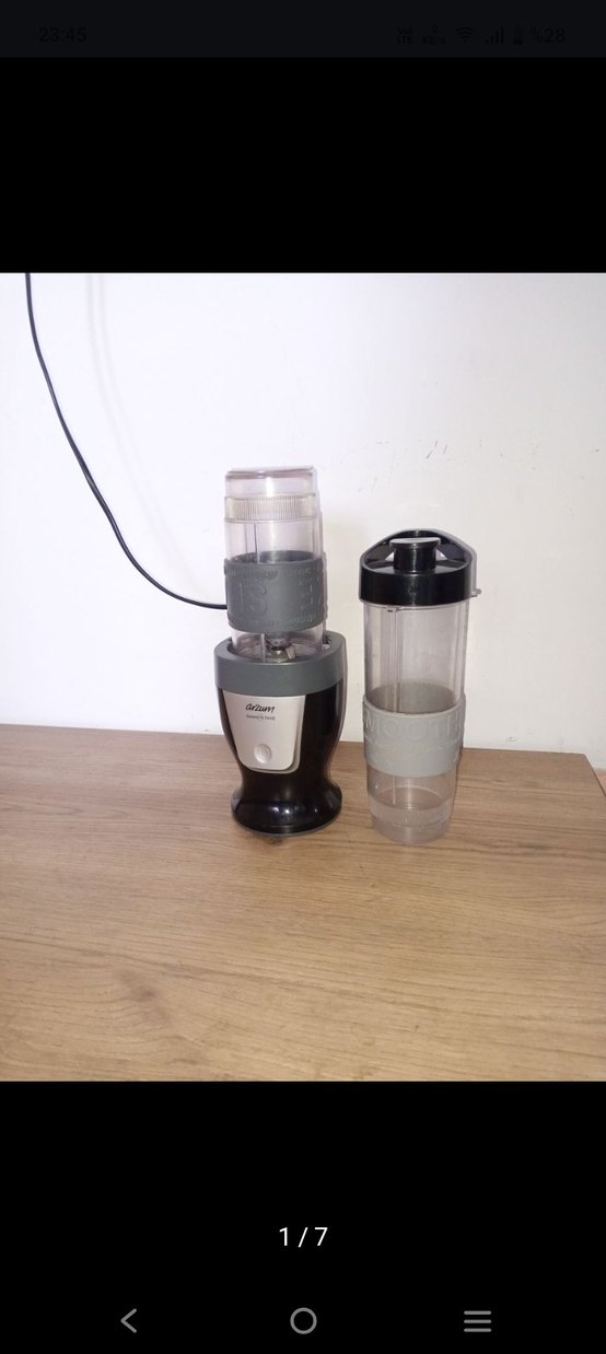 Mutfakta kullanıma uygun, çıkarılabilir kapaklı iki kabı olan gri çubuk blender seti. Bir kabı saklama için kapaklıdır.