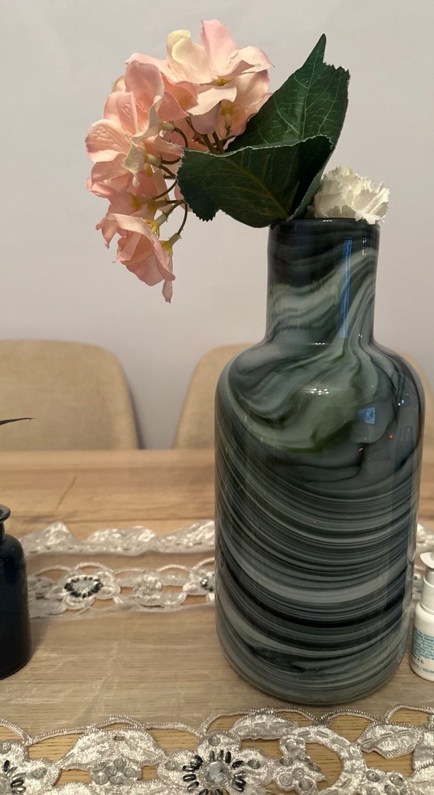 Gri dalgalı desene sahip parlak seramik vazo, çiçek sergilemek için uygun.