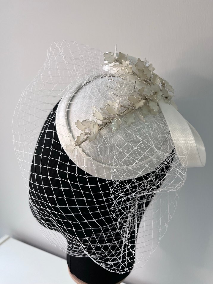 Gri detaylı beyaz dantel ve tülden oluşan, çağdaş tarzda avangart gelin aksesuarı. Trendsetterlar için şık bir seçim.