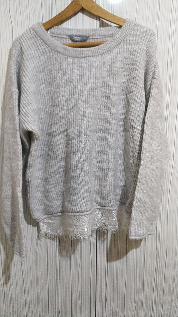 Gri renkli, yuvarlak yaka ve uzun kollu triko kazak, rahat kesimi ve dantel detaylı ucu ile şık ve konforlu bir görünüm sunar. boyu 60. eni 62