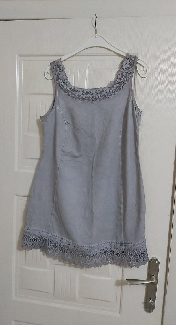 Gri keten kumaştan, dantel detaylı kolsuz elbise. Bol kesim, midi boy, vintage bohem tarzda, günlük kullanım için uygun.