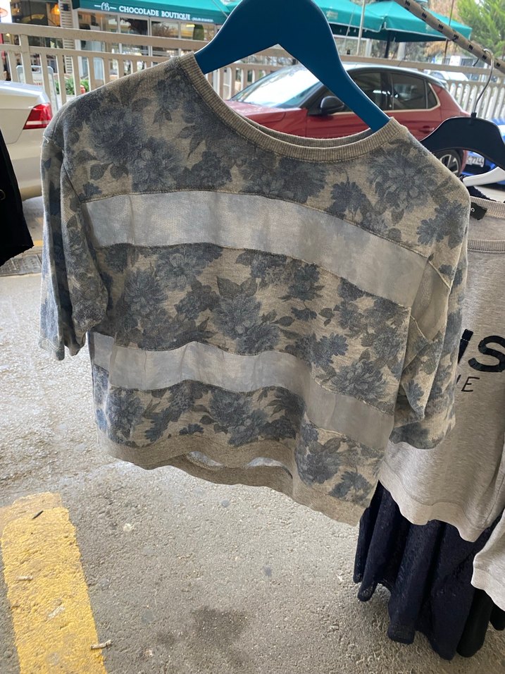 Gri renkli, kısa kollu, yuvarlak yakalı ve dantel detaylı loose fit hamile tişörtü. Çiçek desenleriyle dikkat çeker.