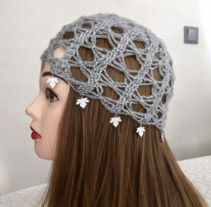 Gri renkte, dantel desenli ve yaprak süslemeli örgü kadın bere, bohem ve gotik tarzları yansıtıyor.