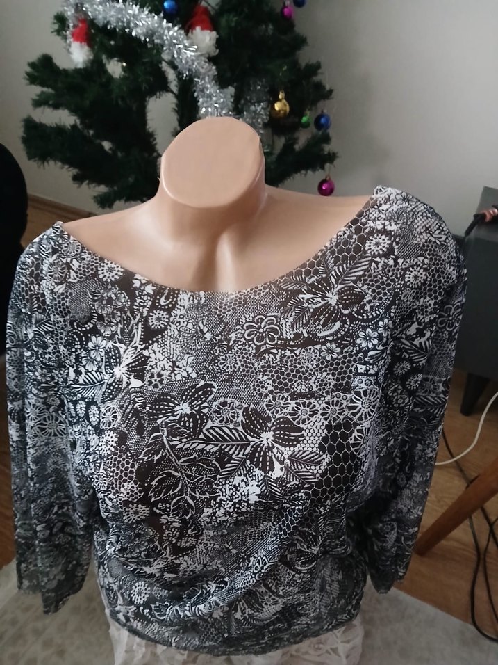 Gri renkte, dantel desenli, uzun kollu ve salaş kesim bir bluz. Tekne yaka ve çağdaş, vintage esintili tasarıma sahiptir.