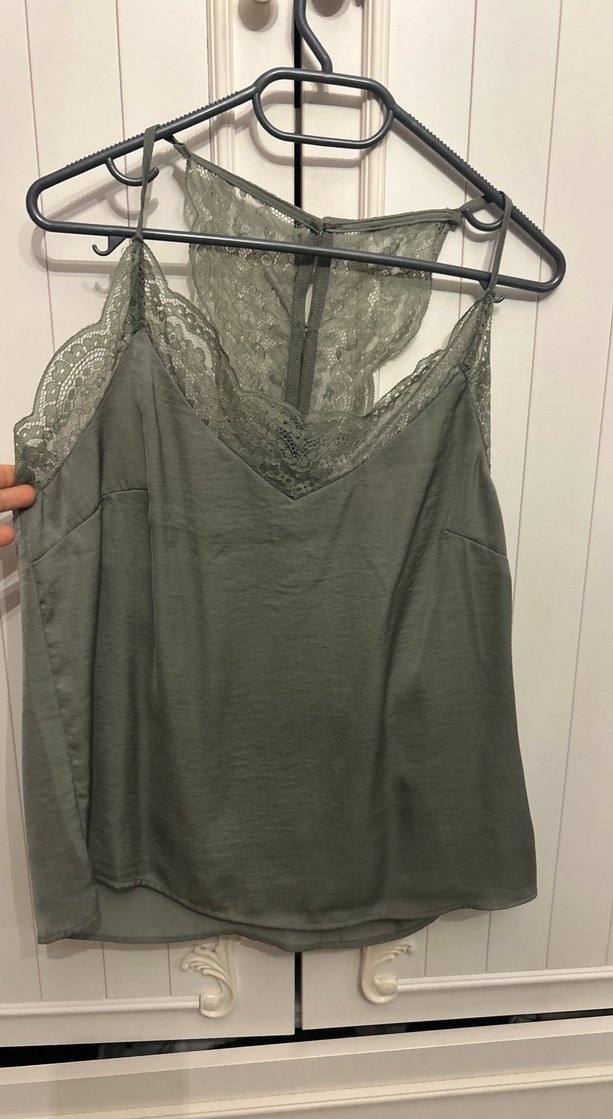 Gri renkte, yumuşak kkumaştan, dantel detaylı ve V yakalı, bol kesim kadın atlet. Bohem tarzıyla günlük kullanıma uygundur.