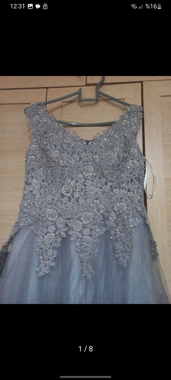 V yaka ve kolsuz kesime sahip, işlemeli dantel detaylı gri uzun abiye elbise, düğünler için şık ve zarif bir tercih. ✨ küçük deformesi var ama göze batmıyor yapistirici izi kalmış sadece, aldığım kişi içindeki simli tülü sökmüstü ben geri diktirdim, tarlatan yoktur ama kabarık duruyor M L uyumlu 65 kiloya uygun