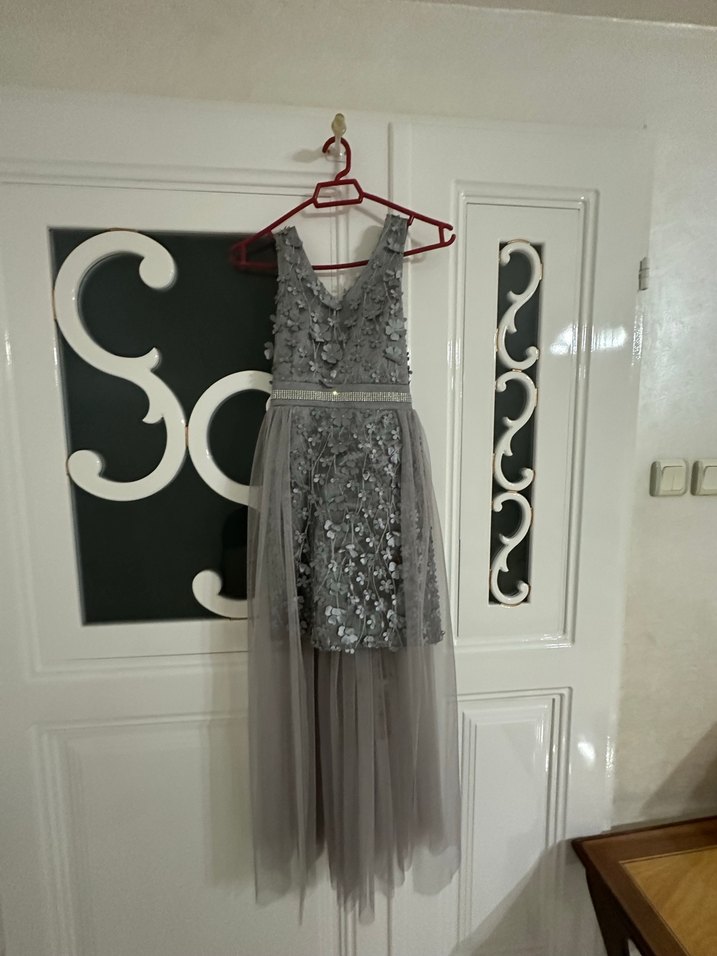 Gri Dantel İşlemeli Uzun Abiye Elbise