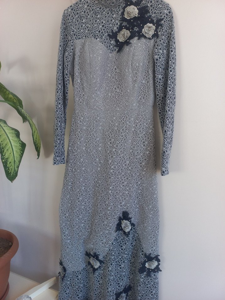 Uzun kollu, yüksek yakalı gri dantel elbise, işlemeli çiçek detayları ve rahat kesimiyle düğünlere uygun.