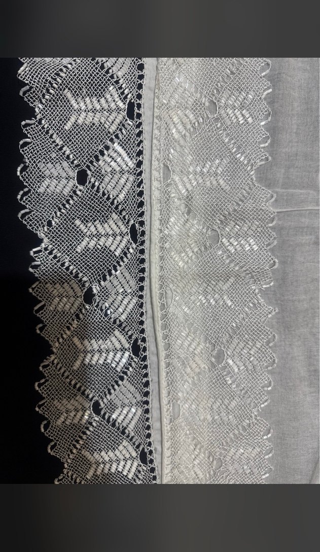 Gri renkli kadın şalı, yumuşak tekstil kumaş üzerine işlenmiş zarif dantel detaylarıyla vintage tarzını yansıtır.