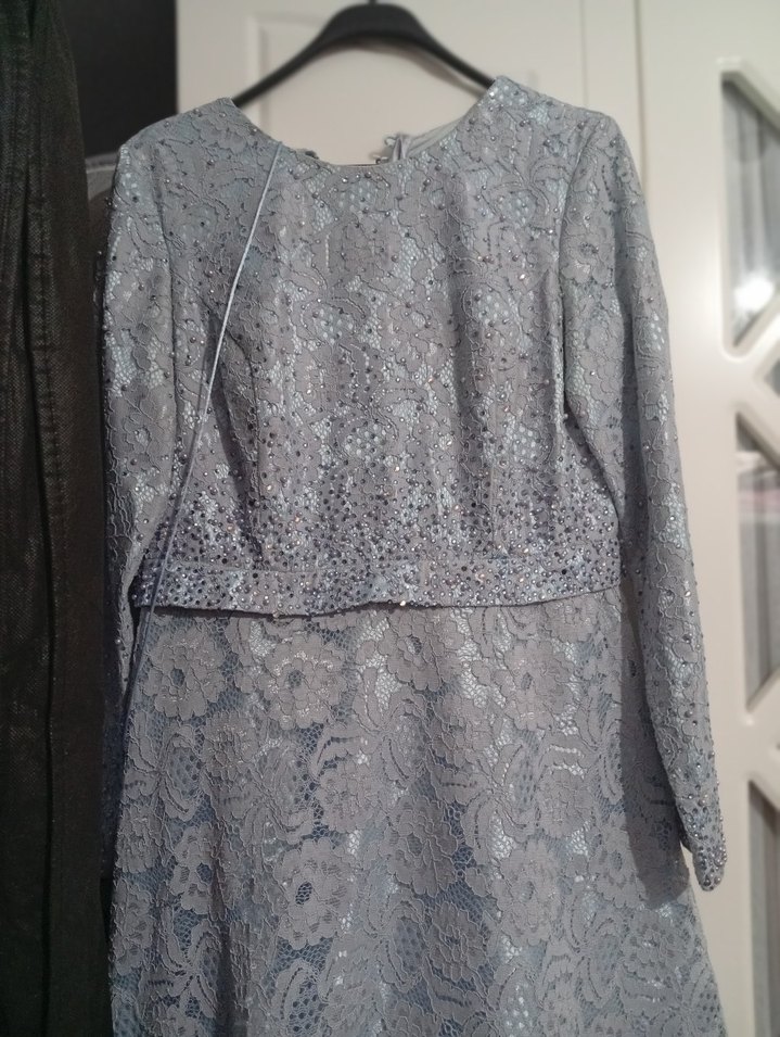 Gri renkli, dantel detaylı uzun abiye elbise. Yuvarlak yaka ve uzun kollu, bol kesim vintage bohem tarzda, düğünler için uygun.
