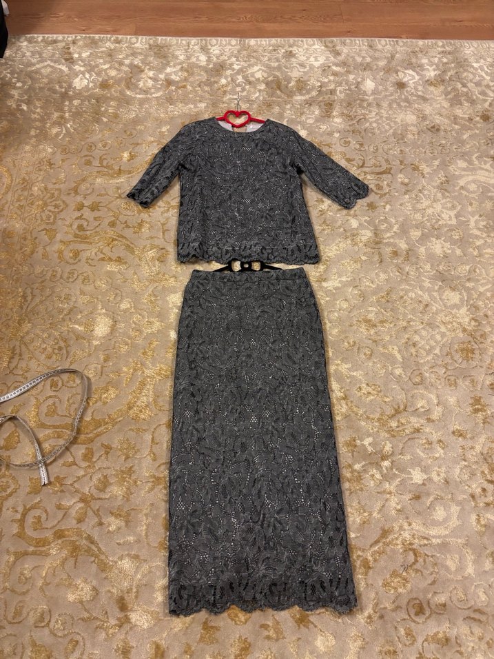 Dantel kumaşlı etek bluz takım. Ghisa markasının. Etek boy 92 cm arkadan açık yırtmaçlı astarlıdır. Yırtmaçı açıktır. Yırtmaç boyu 34 cm dir. Bel 37 cm dir. Etek 40 bedendir. Bluz boy 65 cm göğüs 47 cm dir. 3 bedendir. Ürün hiç giyilmedi. Kendim için aldım. Beğenmediğim yerlerini çıkarttırdım. Tadilat gördü ama giyilmedi.