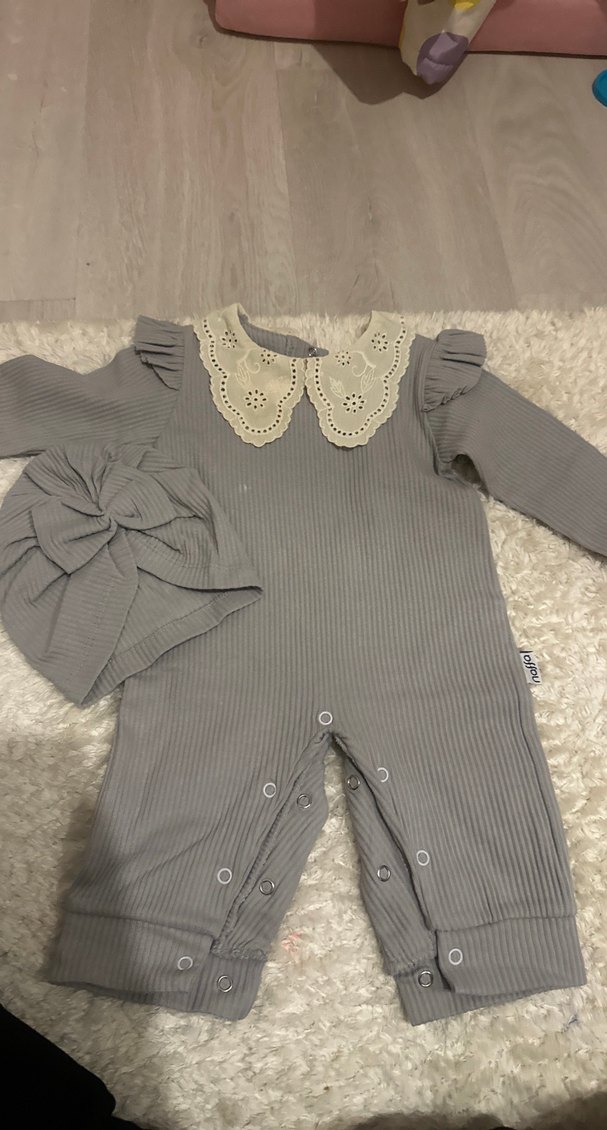 Yumuşak fitilli kumaştan yapılmış, kollarında fırfır ve dantel yakalı gri bebek kız tulumu. Aynı kumaştan şapka dahil.