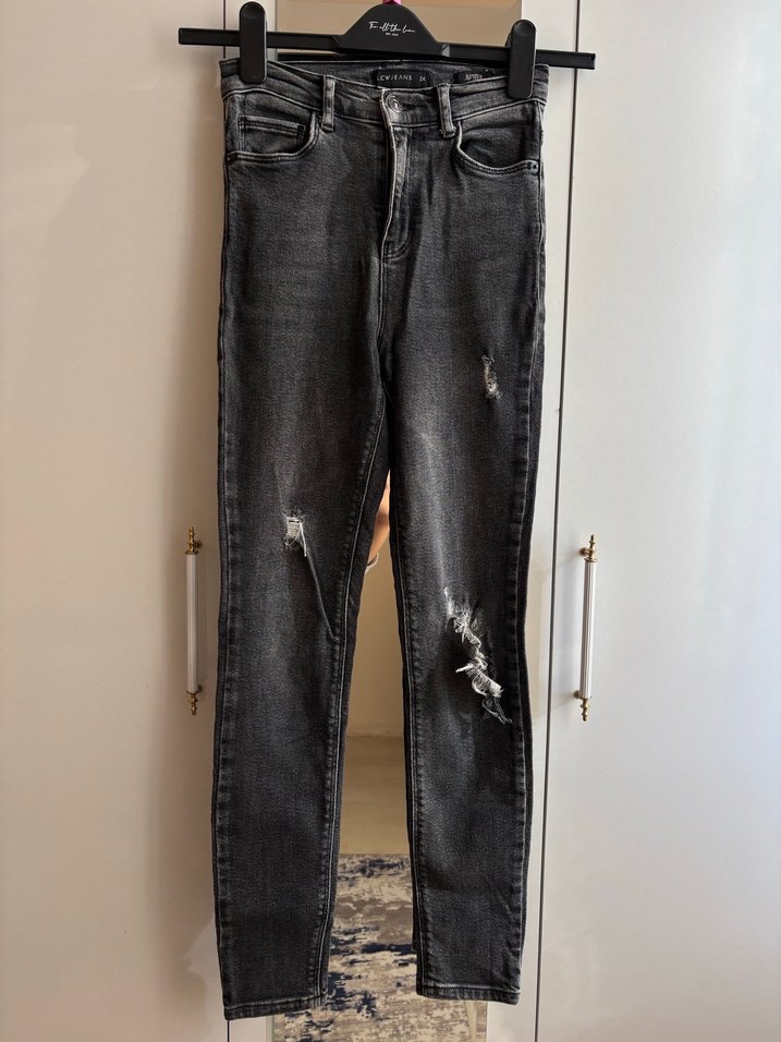Gri, dar kesim denim pantolon,Günlük sokak stiline uygun, grunge punk havasında.