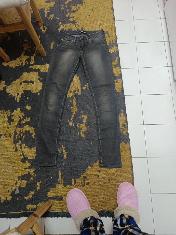 Gri renkli, dar kesim ve uzun boy normal uzunlukta, kadın kot pantolonudur. Günlük sokak stiline uygundur.