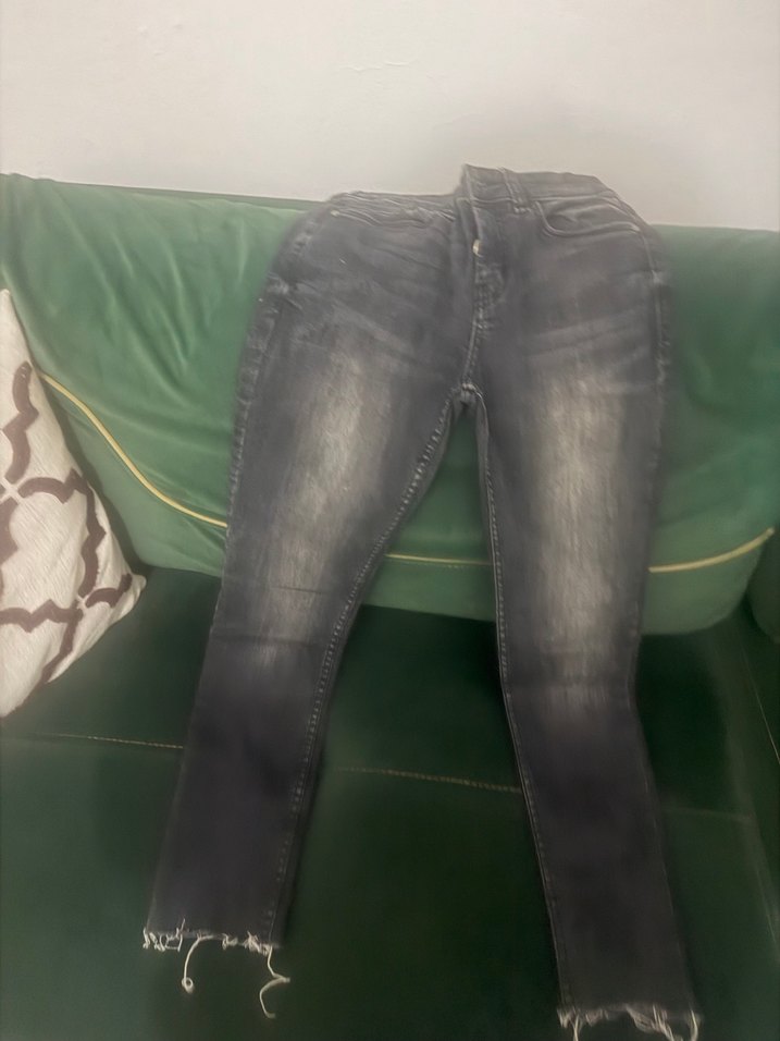 Gri renkte, dar kesim ve midi boy kot pantolon. Kemer tokası detayıyla sokak stiline uygun, günlük kullanıma elverişli.