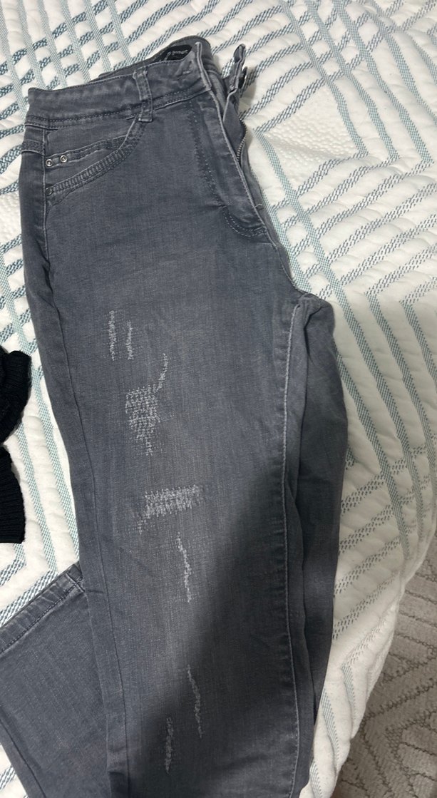 Gri renkte, dar kesim ve midi boy kot pantolon. Yırtmaç detayıyla günlük sokak stili için uygun, desen içermeyen rahat tasarım.