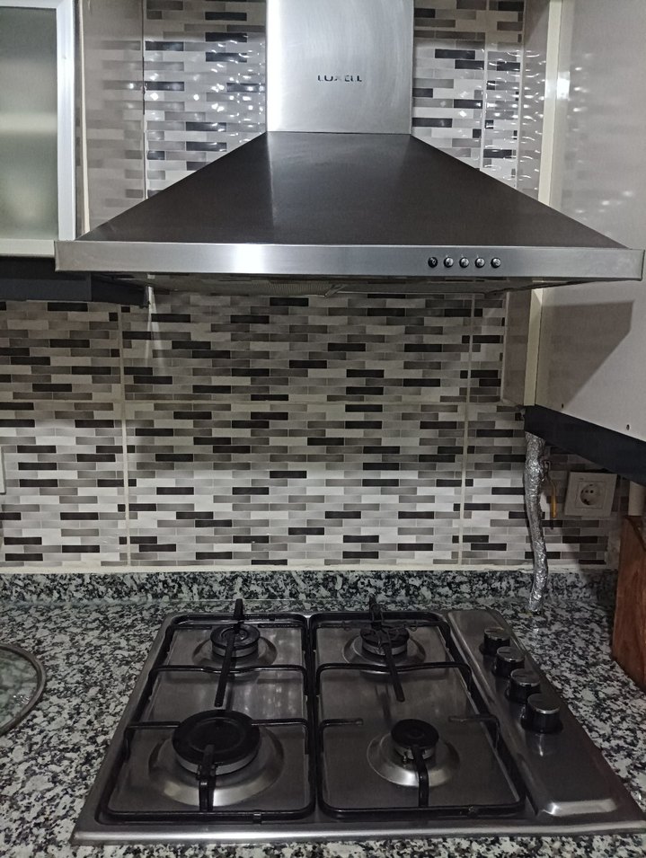 Bu mutfak setinde gri davlumbaz ve dört gözlü gaz ocağı bulunur. Davlumbazda kullanım için düğmeler yer alır.