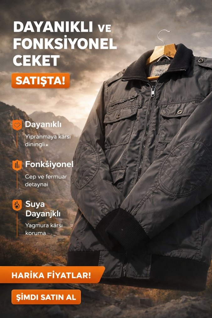 Gri renkli, düğmeli ve yakalı erkek ceket. Dayanıklı sentetik kumaştan, cep ve fermuar detaylı, suya ve rüzgara dayanıklı ve günlük kullanıma uygun(sağ koltuk altında minik bir sökük var)tamiri mümkün.ölçüler resimlerde mevcut.