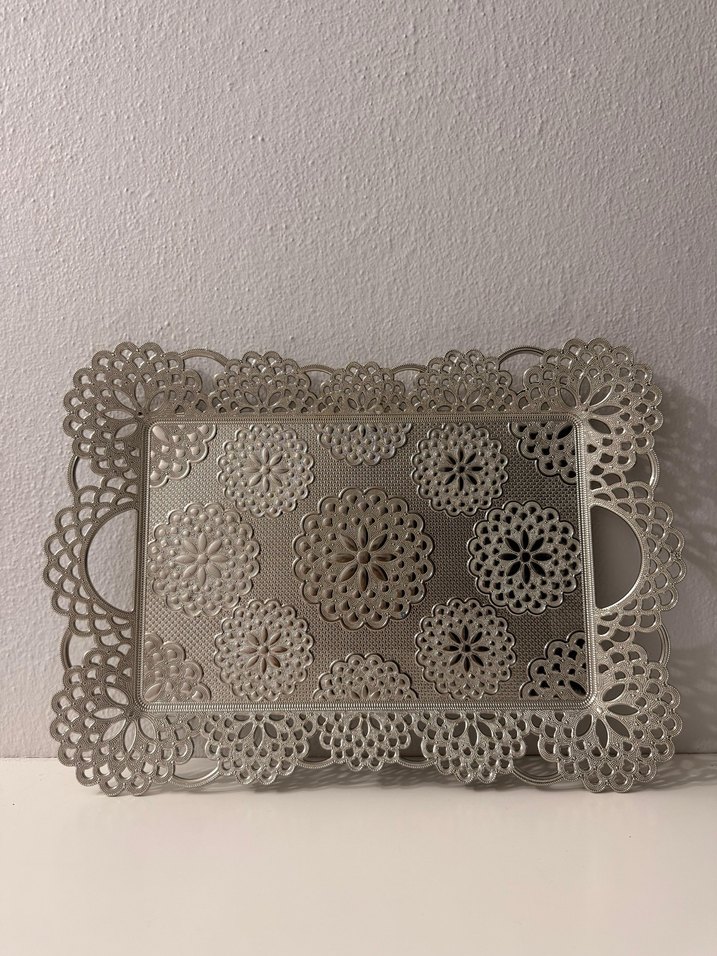 Her iki yanında kulpları bulunan, dantel desenli gri dekoratif metal tepsi, sunum veya sergileme için uygundur.