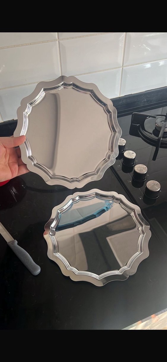 İki adet gri dekoratif metal tepsi, kıvrımlı kenar tasarımı ile mutfakta servis veya sunum için uygundur. ️